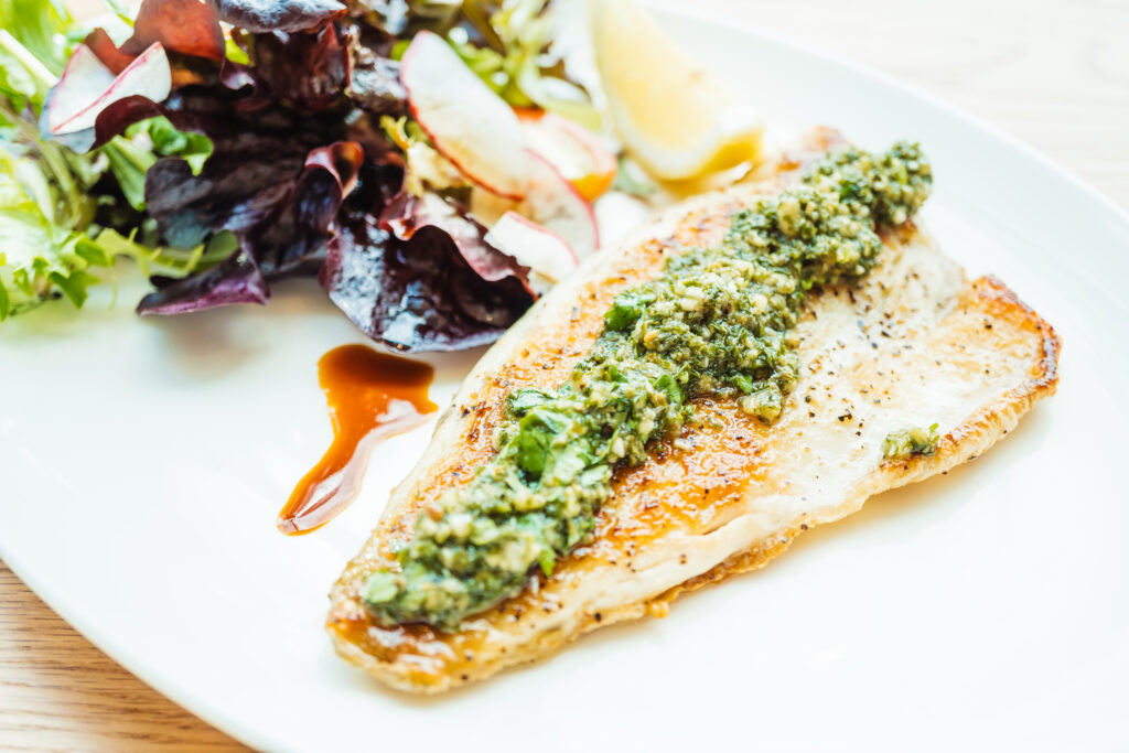 • Season the top of fish fillets with Italian herb seasoning and salt (generously). Fish fillets will have skins on the bottom – no need to season the skins.